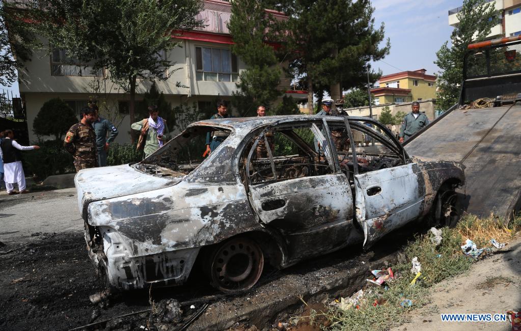 Photo taken on July 20, 2021 shows a damaged vehicle from which rockets were fired in Kabul, Afghanistan. Several rockets were fired on Tuesday at the presidential palace in Kabul, but failed to hit the target, officials and media reports said. (Xinhua/Rahmatullah Alizadah)