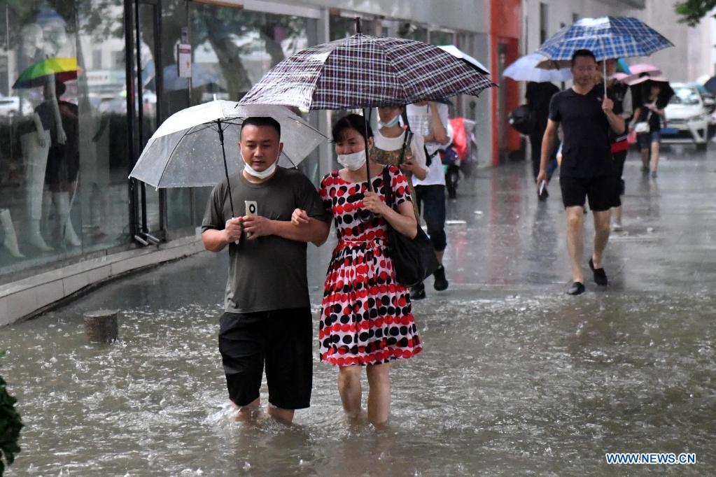 People wade through a waterlogged road in Zhengzhou, capital of central China's Henan Province, July 20, 2021. More than 144,660 residents have been affected by torrential rains in central China's Henan Province since July 16, and 10,152 have been relocated to safe places, the provincial flood control and drought relief headquarters said Tuesday. A total of 16 large and medium-sized reservoirs have seen water levels rise above the alert level after torrential rains battered most parts of the province on Monday and Tuesday. (Xinhua/Zhu Xiang)