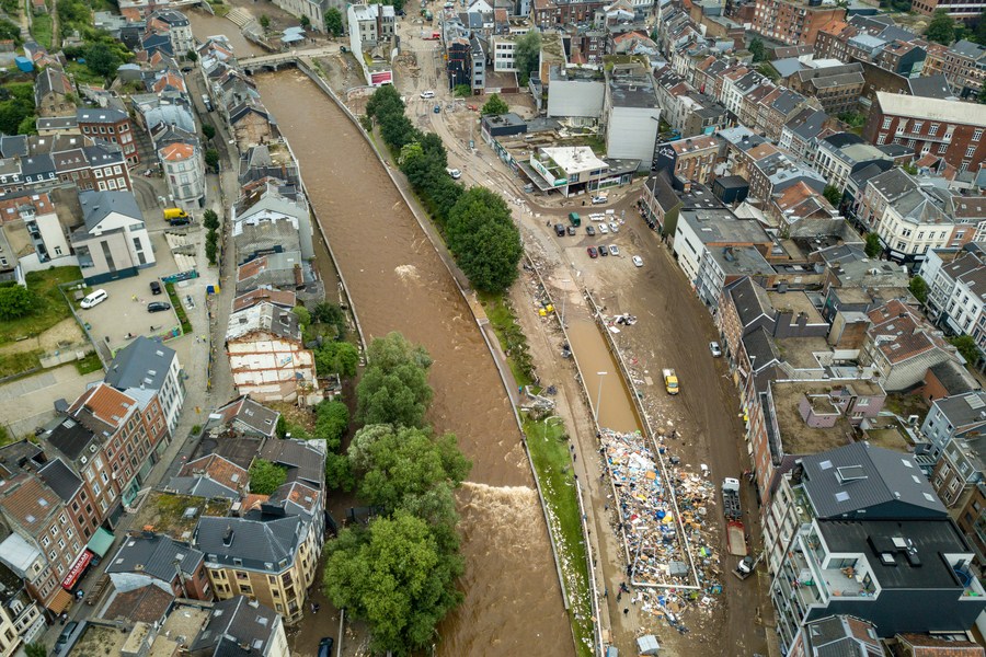 Aerial photo taken on July 16, 2021 shows a scene after floods in Verviers, Belgium. (Xinhua/Zhang Cheng)