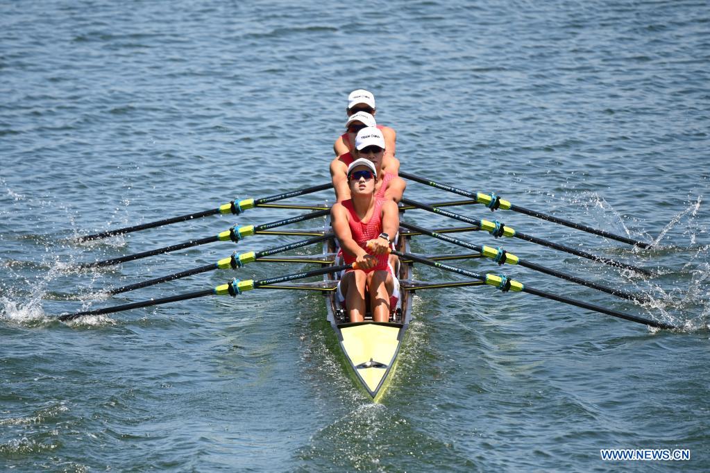 Zhang Yunxia, Zhang Ling, Lyu Yang and Cui Xiaotong of China compete during Women's Quadruple Sculls Heat of the rowing event of the Tokyo 2020 Olympics at the Sea Forest Waterway in Tokyo, Japan, July 23, 2021. (Xinhua/Dai Tianfang)