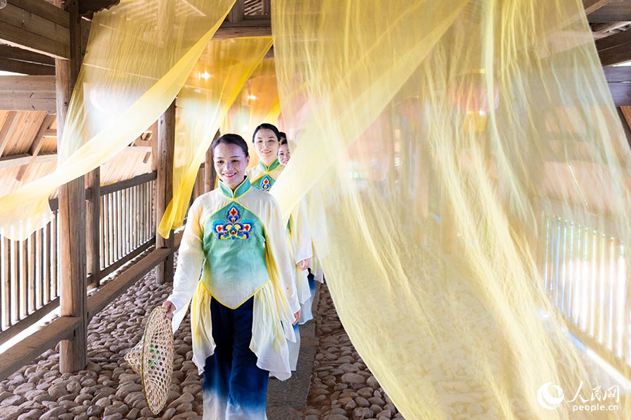 | Photo shows a performance combining fabrics dyed in iridescent colors extracted from crop waste and dance. (People’s Daily Online/Jiao Yan) |