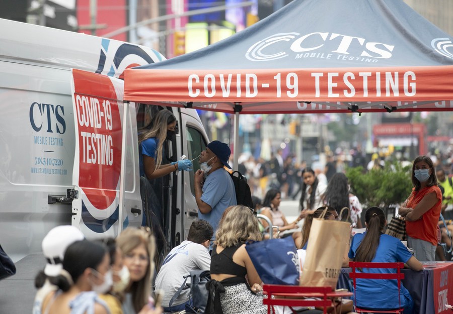 A man receives COVID-19 test at a mobile testing site in Times Square, New York, the United States, on July 20, 2021. (Xinhua/Wang Ying)