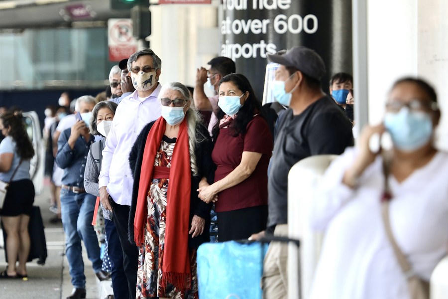 Travelers with face masks are seen at the Los Angeles International Airport in Los Angeles, the United States, July 18, 2021. (Xinhua)