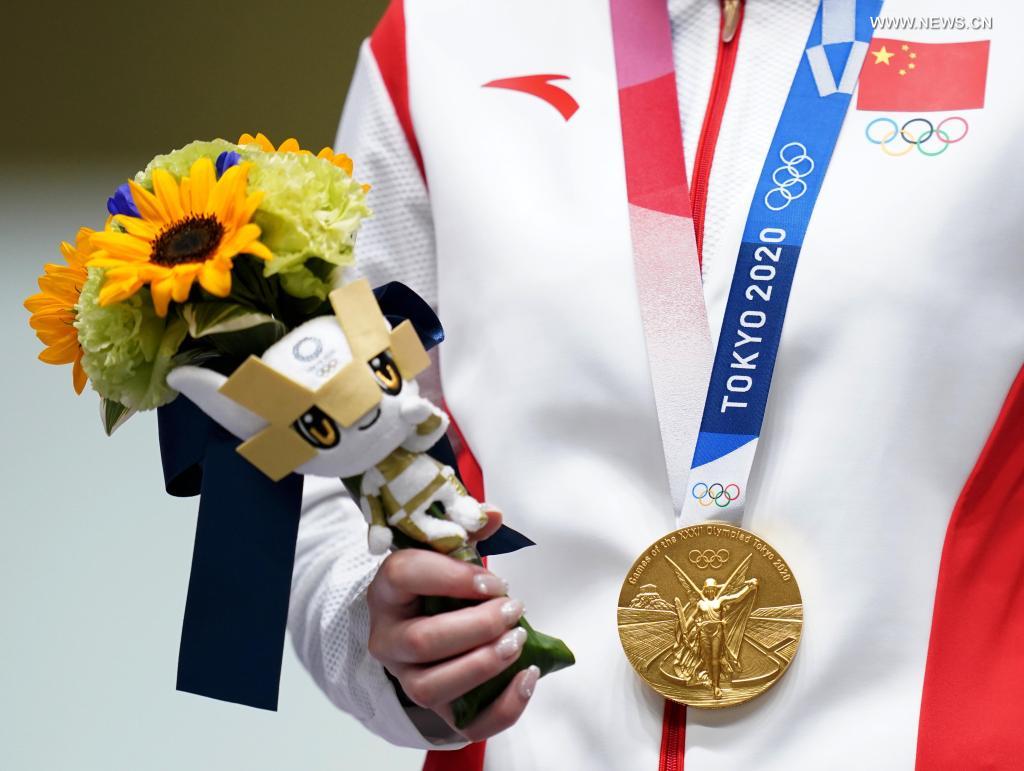 Yang Qian of China poses during the awarding ceremony after the Tokyo 2020 women's 10m air rifle final in Tokyo, Japan, July 24, 2021. (Xinhua/Ju Huanzong)