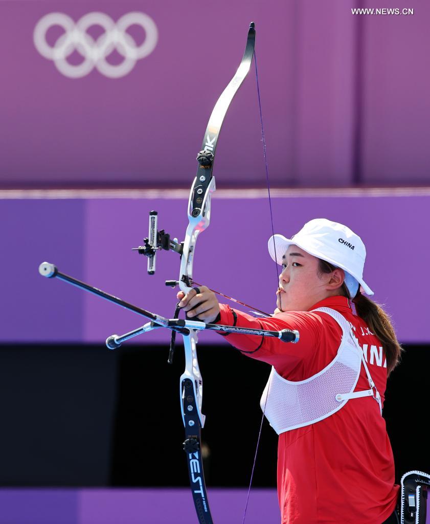 Wu Jiaxin of China competes during the mixed team 1/8 eliminations of archery at the Tokyo 2020 Olympic Games at Yumenoshima Park Archery Field in Tokyo, Japan, July 24, 2021. (Xinhua/Li Gang)