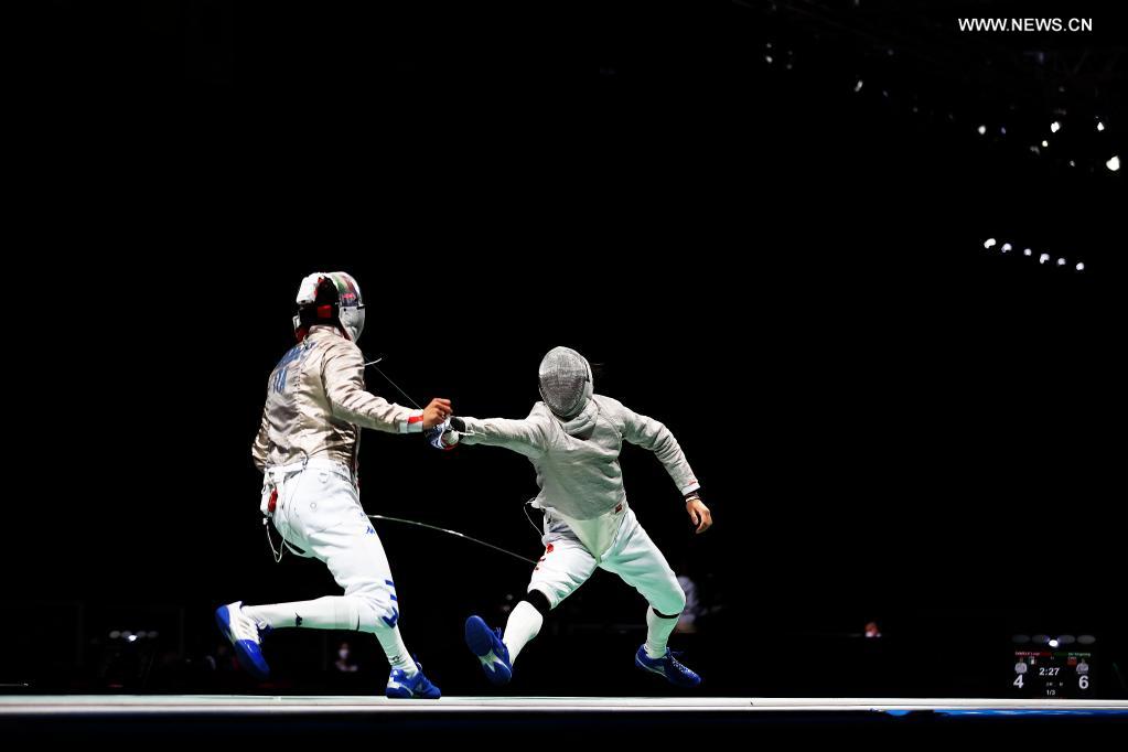 China's Xu Yingming (R) competes with Italy's Luigi Samele during the men's Sabre Individual table of 32 at Tokyo 2020 Olympic Games in Tokyo, July 24, 2021. (Xinhua/Li Ming)