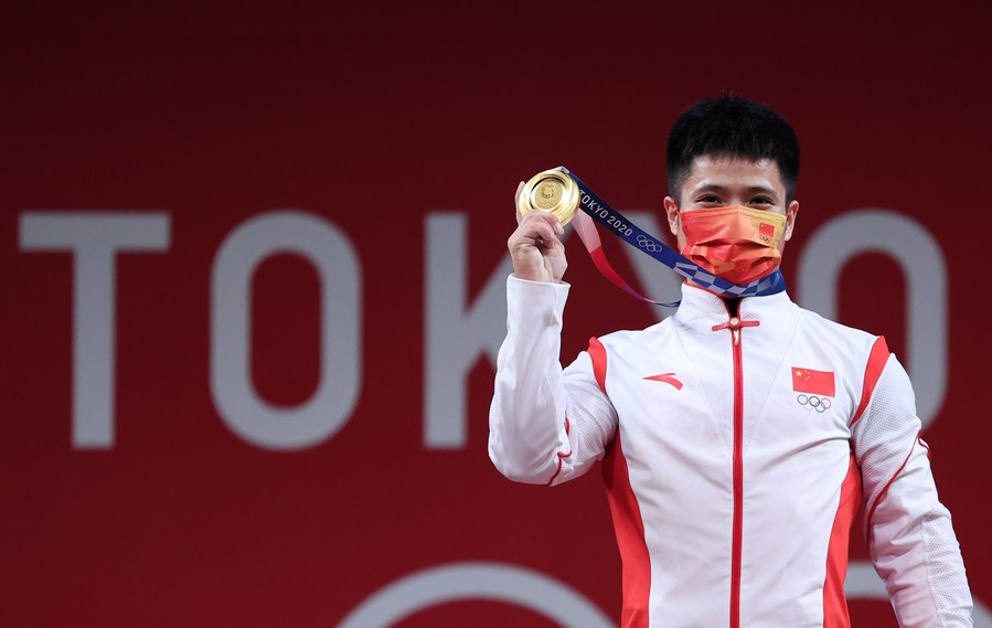Li Fabin poses with his gold medal after the men's 61kg weightlifting event at Tokyo 2020 on July 25, 2021. (Xinhua/Yang Lei)