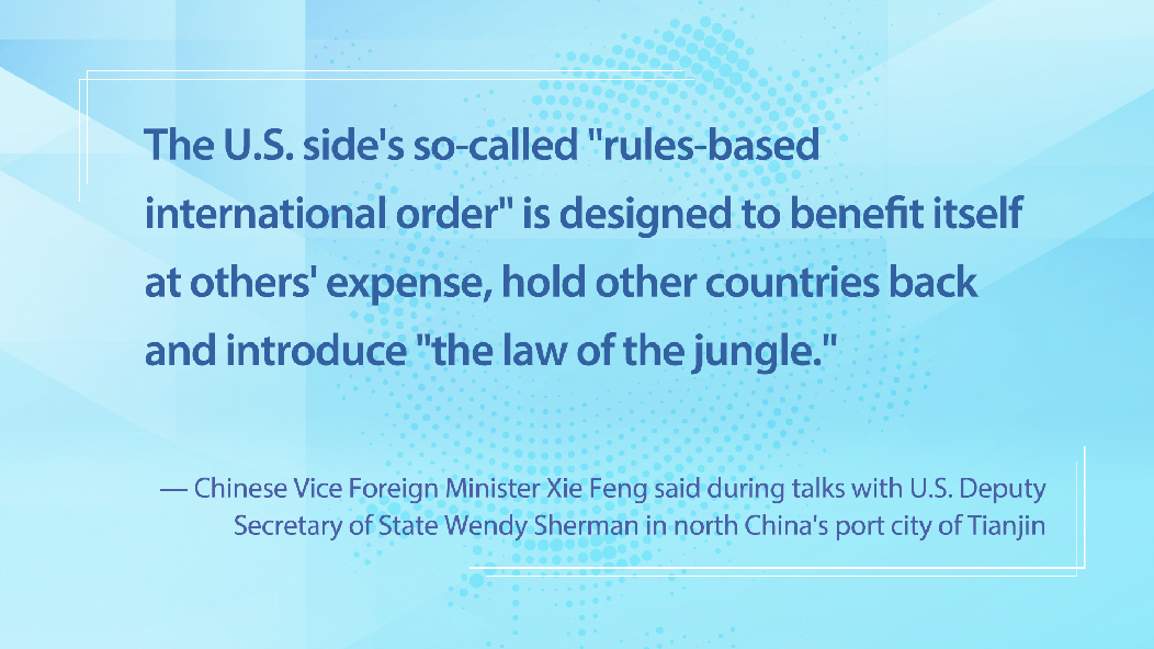 The U.S. side's so-called "rules-based international order" is designed to benefit itself at others' expense, hold other countries back and introduce "the law of the jungle," Xie said.
