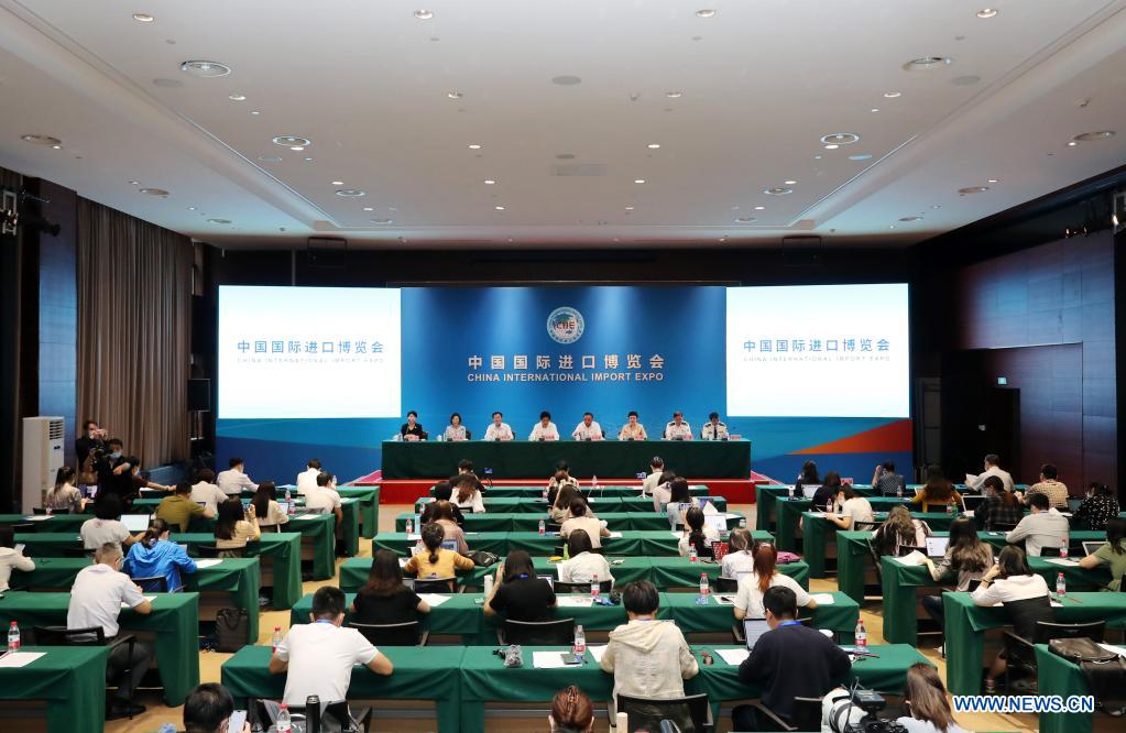 A press conference on the China International Import Expo (CIIE) is held at the National Exhibition and Convention Center (Shanghai), east China's Shanghai, July 26, 2021. The fourth CIIE, scheduled from Nov. 5 to 10 in Shanghai, is expected to see the participation from more Fortune 500 companies and corporate giants than the previous edition, organizers said Monday. (Xinhua/Fang Zhe)