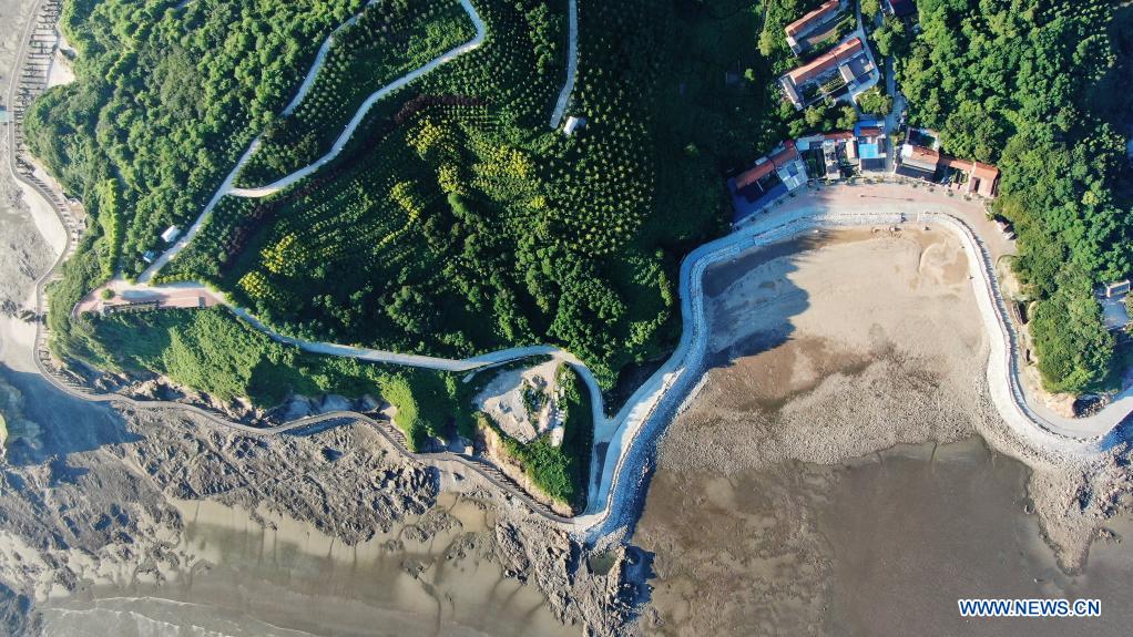 Aerial photo taken on July 26, 2021 shows the walkways for tourists on the Zhangdao Island, Dandong City, northeast China's Liaoning Province. Zhangdao Island, with local residents depending on tourism, seafood aquaculture and marine fishing industry, attracts numerous tourists to come to visit during summer holidays. (Xinhua/Yang Qing)