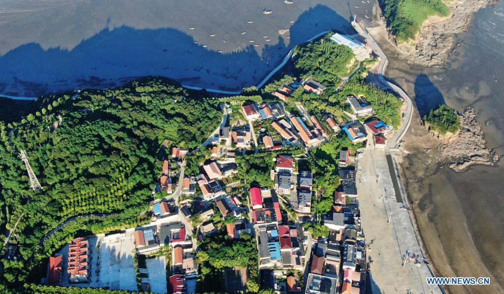 Aerial photo taken on July 26, 2021 shows the landscape of Zhangdao Island, Dandong City, northeast China's Liaoning Province. Zhangdao Island, with local residents depending on tourism, seafood aquaculture and marine fishing industry, attracts numerous tourists to come to visit during summer holidays. (Xinhua/Yang Qing)