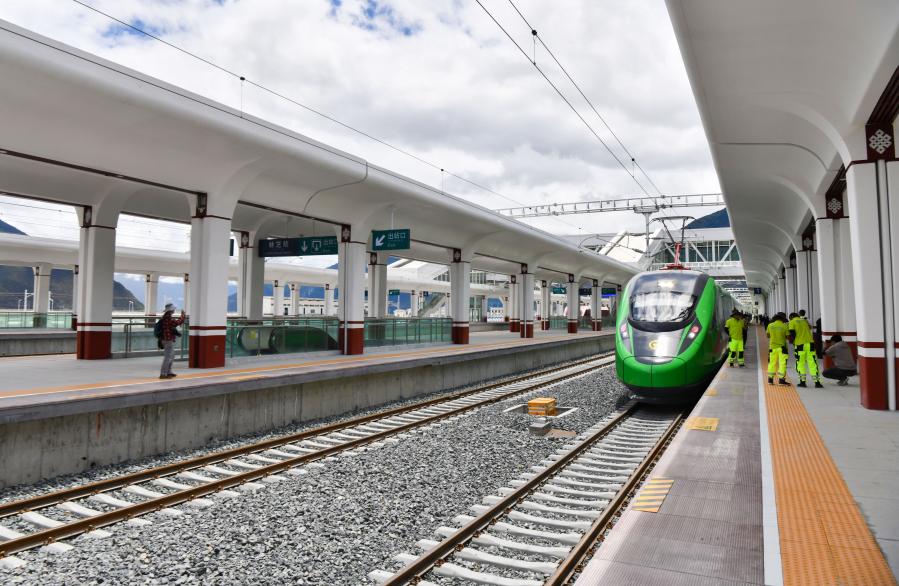 The Fuxing bullet train of the Lhasa-Nyingchi railway arrives in Nyingchi, southwest China's Tibet Autonomous Region, June 25, 2021. (Xinhua/Jigme Dorje)