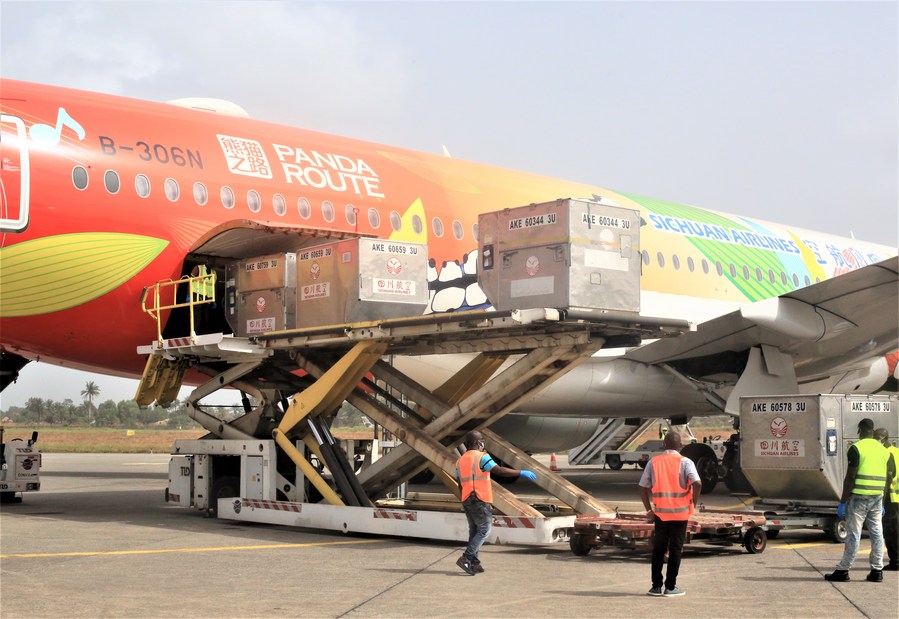 Workers unload the COVID-19 vaccine donated by China at an airport in Freetown, Sierra Leone, on Feb. 25, 2021. (Photo by Abu/Xinhua)