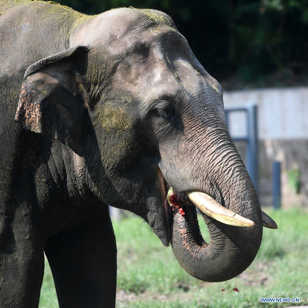 An elephant feeds on watermelon at Chongqing Zoo in southwest China's Chongqing, July 29, 2021. Chongqing Zoo tries every means to help animals fend off the summer heat in recent days. (Xinhua/Tang Yi)