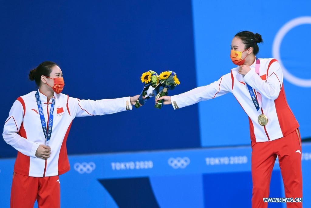 Zhu Xueying (R), Liu Yingying of China react during the awarding ceremony for the women's final of trampoline gymnastics at the Tokyo 2020 Olympic Games in Tokyo, Japan, July 30, 2021. (Xinhua/He Changshan)