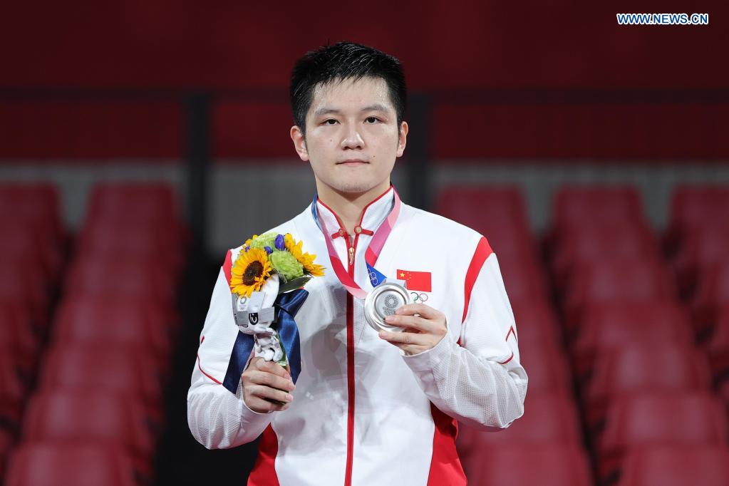 China's Fan Zhendong poses for photos with his silver medal during the awarding ceremony of the men's singles of table tennis at Tokyo 2020 Olympic Games in Tokyo, Japan, July 30, 2021. (Xinhua/Wang Dongzhen)