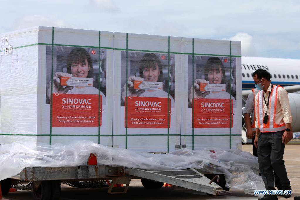 A batch of China's Sinovac COVID-19 vaccines arrives at the Phnom Penh International Airport in Phnom Penh, Cambodia, July 31, 2021. A plane carrying a new batch of Sinovac COVID-19 vaccine landed in Phnom Penh, capital of Cambodia, on Saturday, giving another boost to the country in its vaccination drive. (Xinhua/Ly Lay)