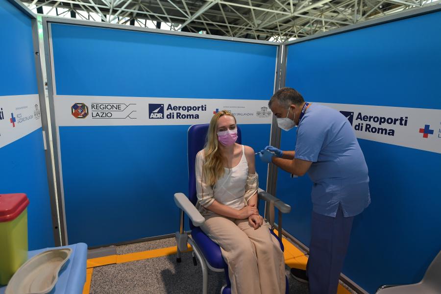 A medical worker administers a dose of the COVID-19 vaccine to a recipient at the Fiumicino airport in Rome, Italy, July 29, 2021. (Photo by Alberto Lingria/Xinhua)