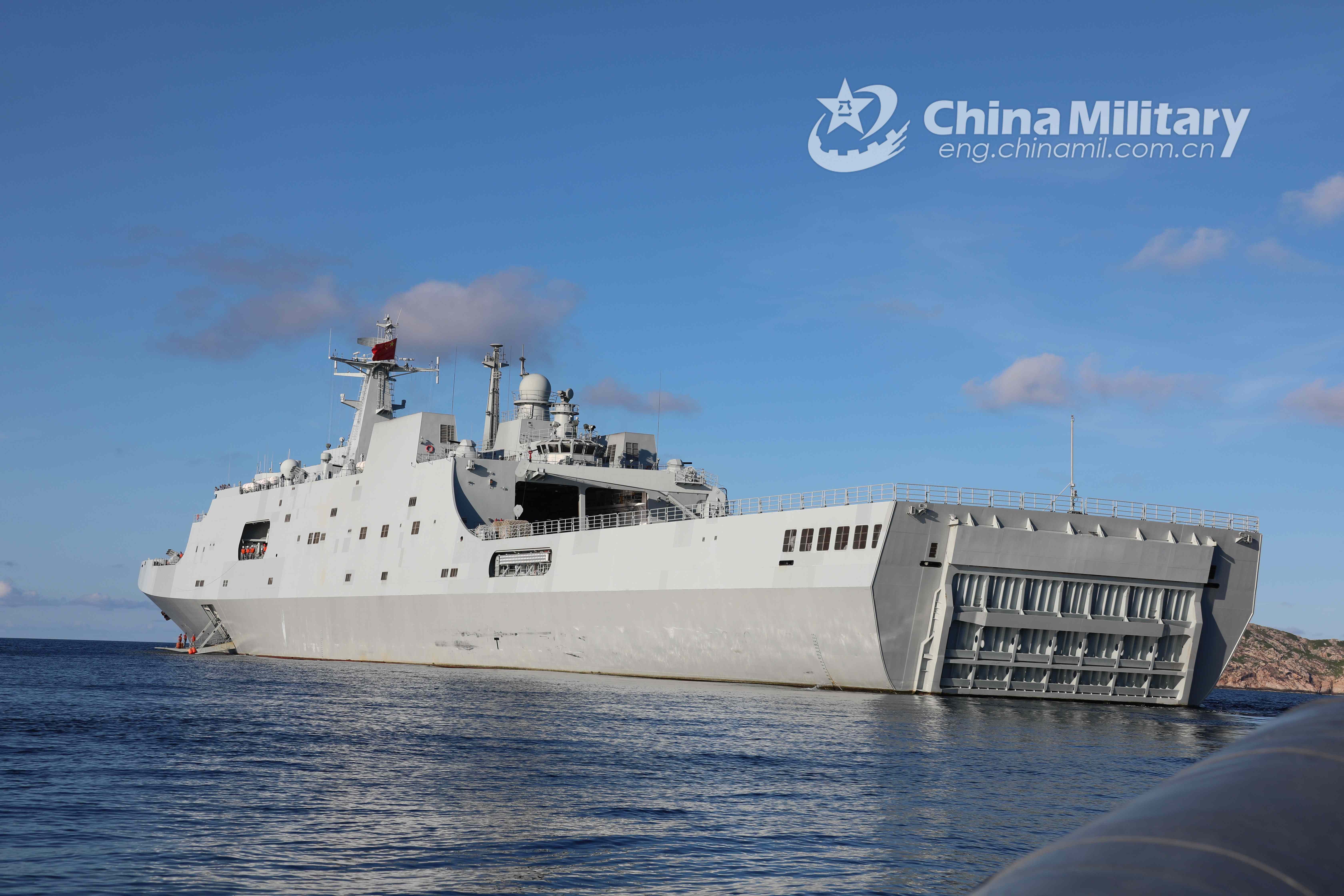 The amphibious transport dock landing ship Kunlunshan (Hull 998) and the amphibious dock landing ship Qilianshan (Hull 985) attached to a landing ship flotilla with the navy under the PLA Southern Theater Command steam in formation in waters of the South China Sea in mid July, 2021. (eng.chinamil.com.cn/Photo by Qiao Chenxi)