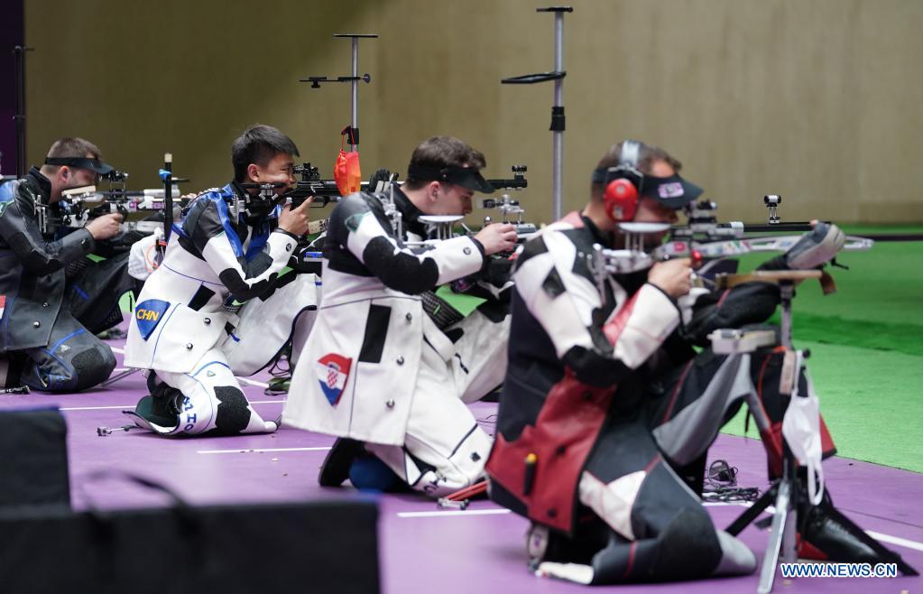 Zhang Changhong (3rd R) of China competes during the 50m rifle 3 positions men's final at the Tokyo 2020 Olympic Games in Tokyo, Japan, Aug. 2, 2021. (Xinhua/Ju Huanzong)
