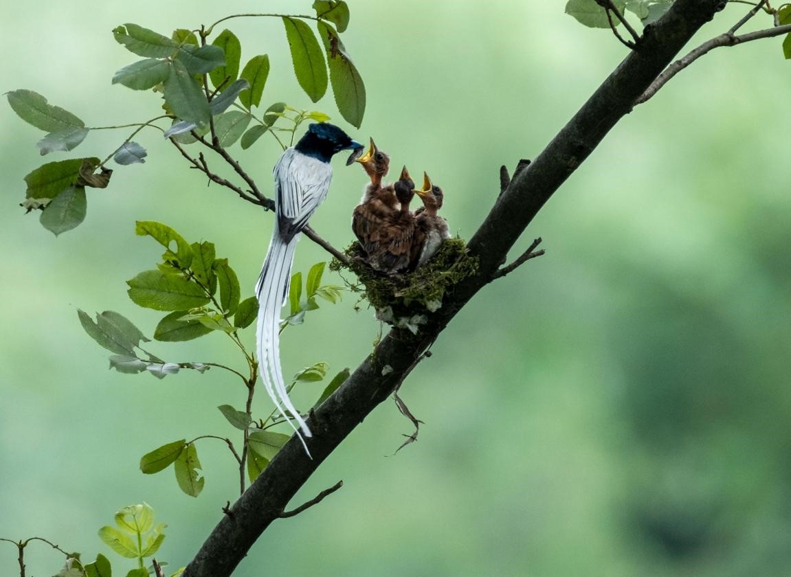 A paradise flycatcher feeds its offspring in Guanfan village, Shangcheng county, Xinyang city, central China’s Henan province, July 13, 2021. Paradise flycatcher was included into the International Union for Conservation of Nature’s Red List of Threatened Species in 2012. (Photo by Shui Congze/People’s Daily Online)