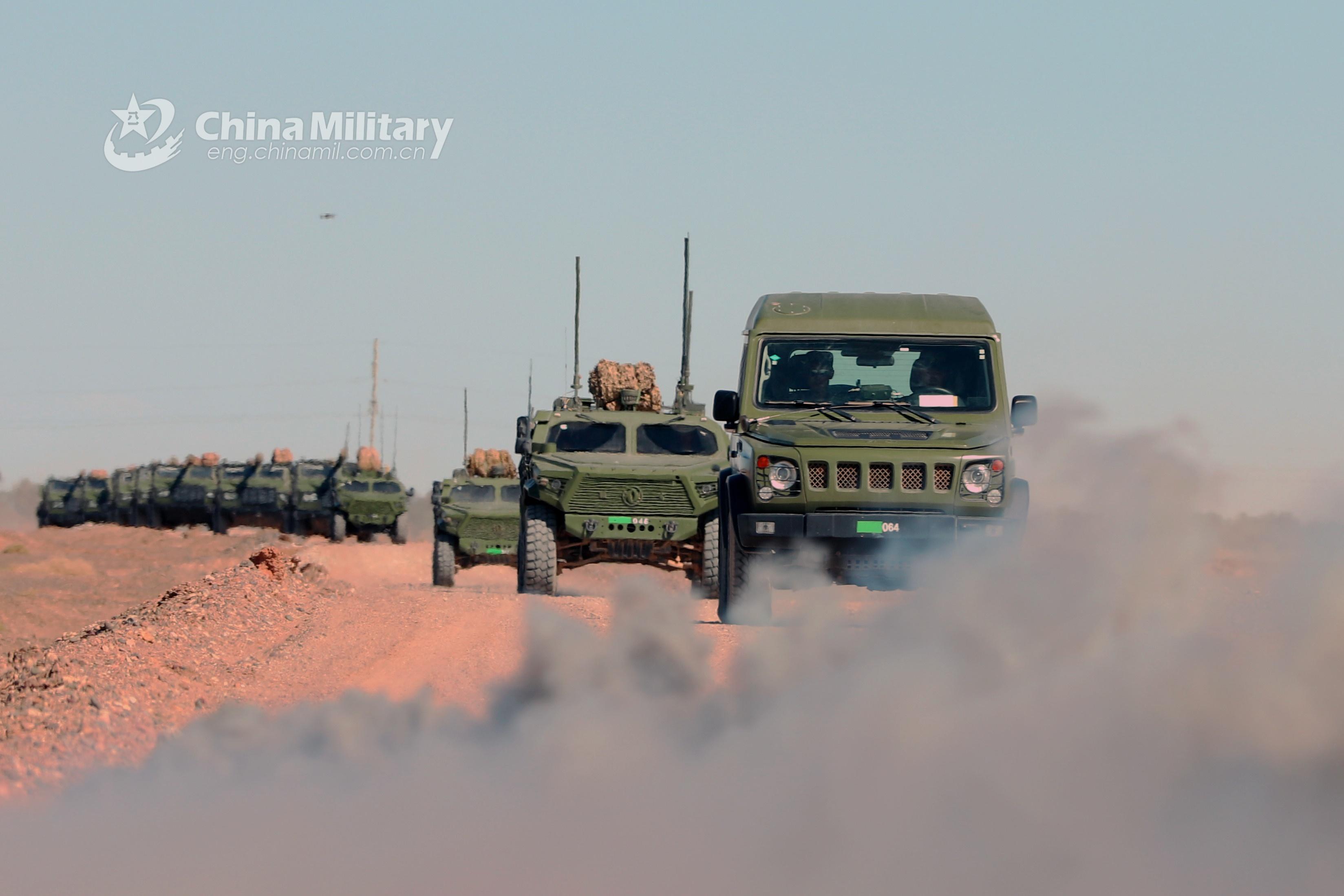 A convoy of armed military trucks rumbles in speed through the simulated infected zone on unfamiliar territory during the integrated training exercise organized by an artillery brigade under the PLA 72nd Group Army on July 17, 2021. The exercise aimed to assess the troops’ operational adaptability in realistic combat scenario. (eng.chinamil.com.cn/Photo by Huang Baochuan)