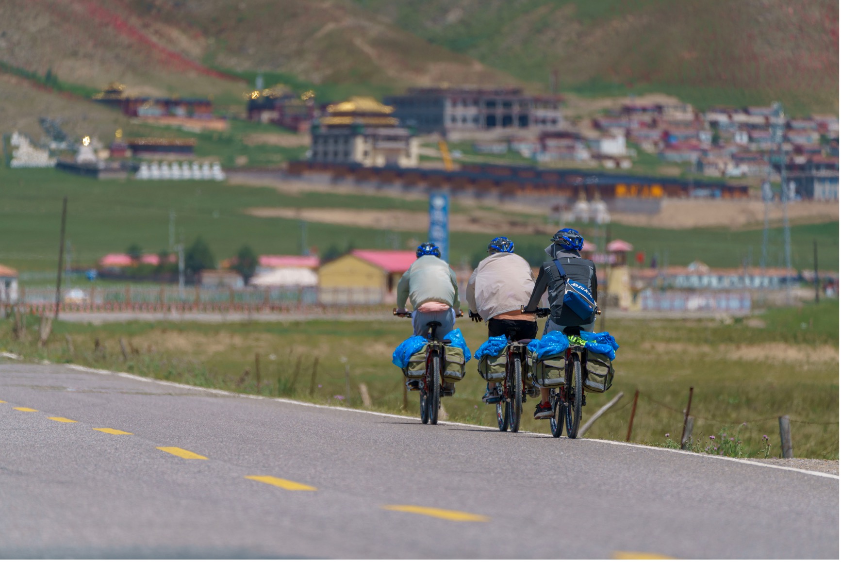 Photo taken on July 28, 2021 shows cyclists around the Qinghai lake at Hainan Tibetan Autonomous Prefecture, northwest China’s Qinghai Province. (People’s Daily Online/Zhang Ruohan)