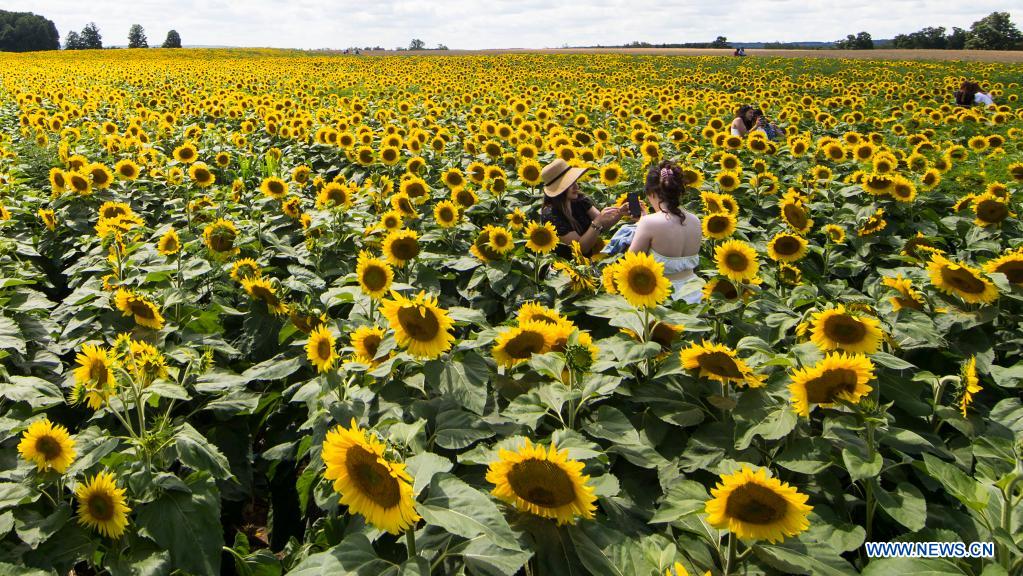 People visit Davis Family Farm during the Sunflower Festival in Caledon, Ontario, Canada, on Aug. 2, 2021. With 45 acres of sunflowers, the festival was held here from July 24 to Aug. 8 this year. (Photo by Zou Zheng/Xinhua)