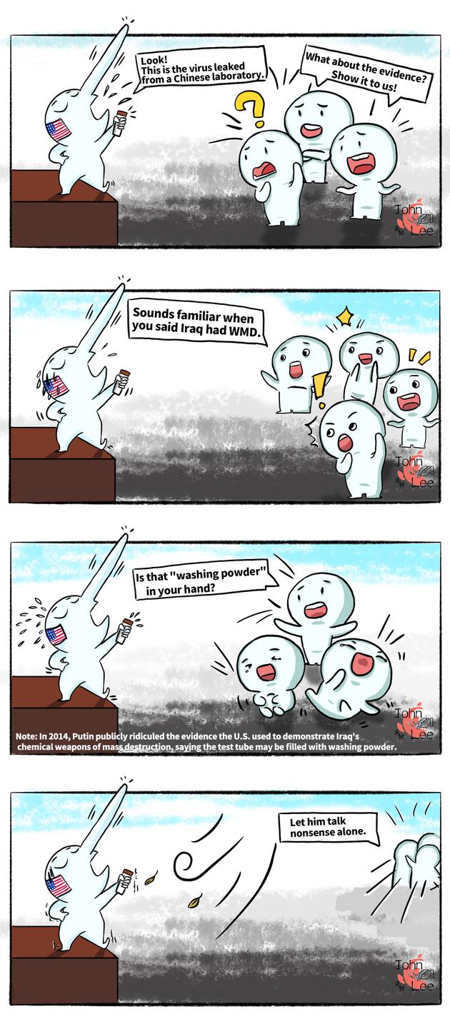 (ECNS) -- The U.S. hype on the so-called COVID-19 “l(fā)ab-leak theory” goes against science and basic facts. Their finger-pointing on China looks so similar to the play when Colin Powell, former U.S. Secretary of State, wielded the infamous test tube full of washing powder as evidence of weapons of mass destruction developed in Iraq. But no lie will turn into truth, no matter how many times it was repeated. The “washing powder” will only stain the credibility and reputation of the U.S. itself. (John Lee)