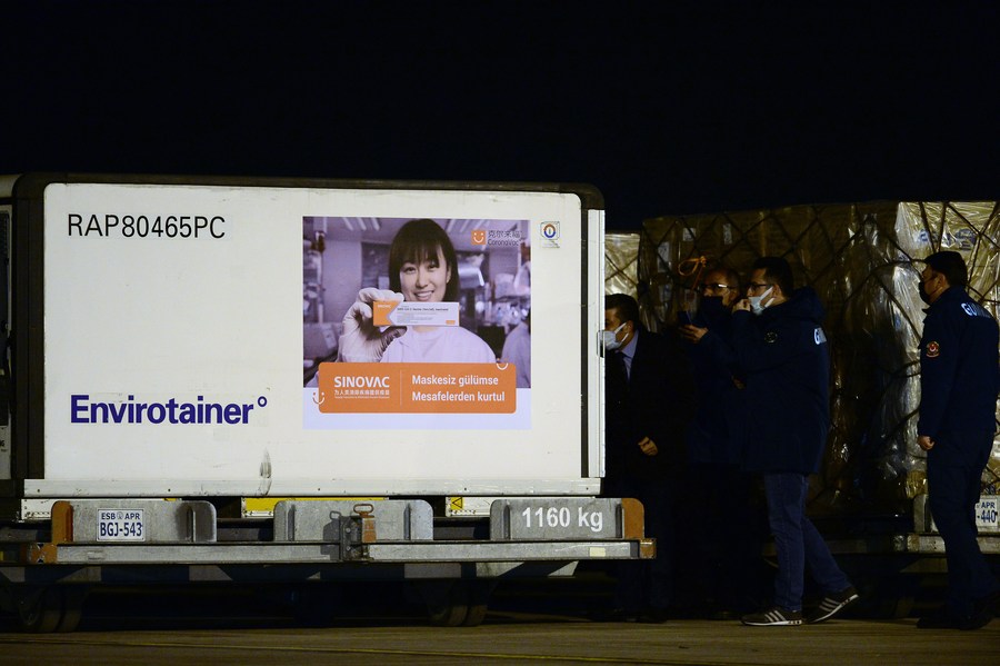 A shipment containing boxes of China's Sinovac COVID-19 vaccine arrives at Esenboga Airport in Ankara, Turkey, Dec. 30, 2020. (Photo by Mustafa Kaya/Xinhua)