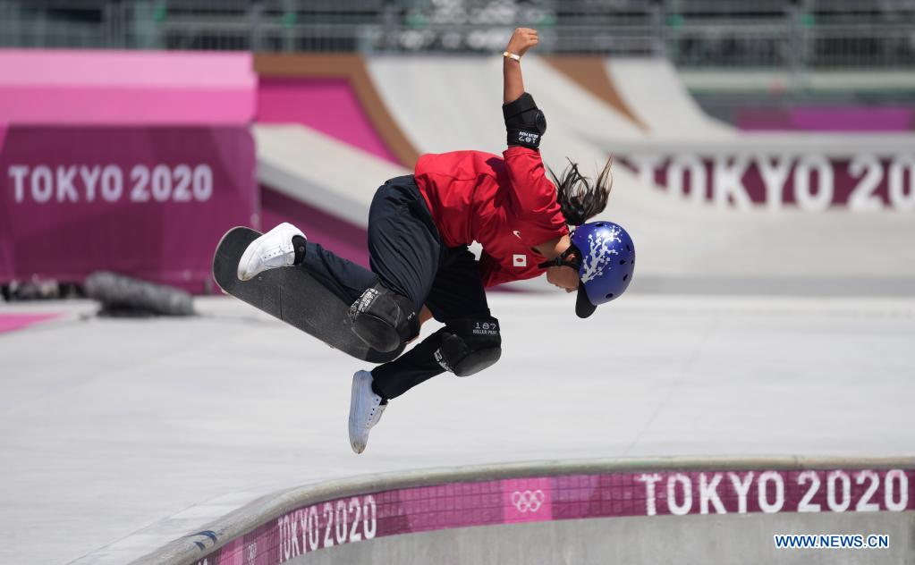 Sakura Yosozumi of Japan warms up before women's park final of skateboarding at the Tokyo 2020 Olympic Games in Tokyo, Japan, Aug. 4, 2021. (Xinhua/Li Ga)