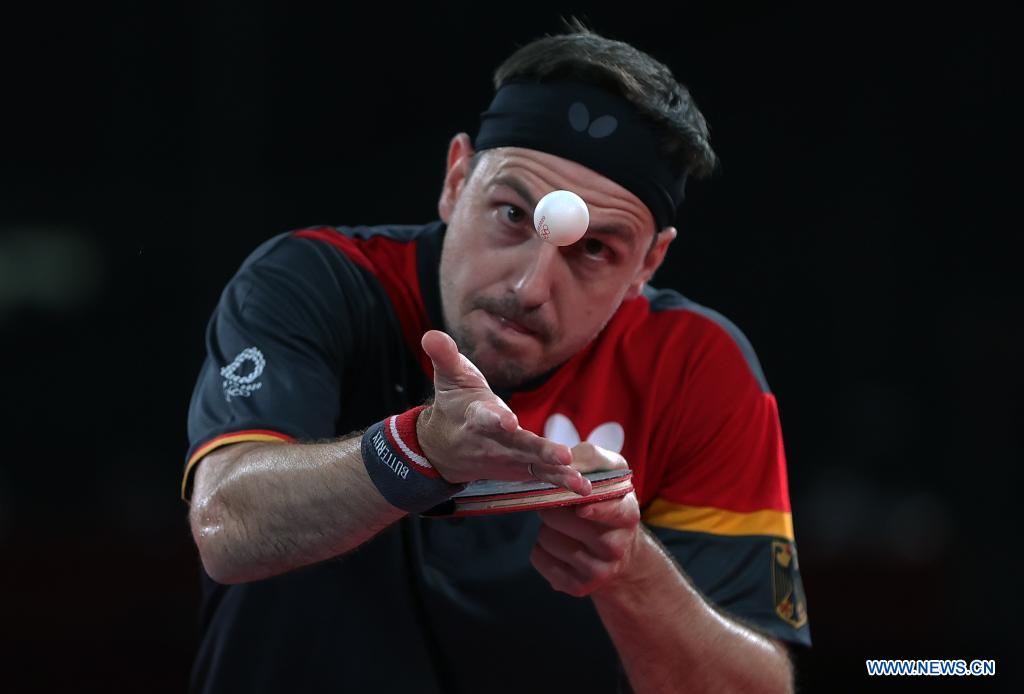 Germany's Timo Boll serves during the table tennis men's team semifinal between Germany and Japan at the Tokyo 2020 Olympic Games in Tokyo, Japan, Aug. 4, 2021. (Xinhua/Wang Dongzhen)