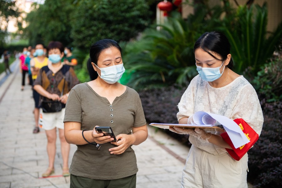 A volunteer (R) checks personal information of a resident before COVID-19 nucleic acid testing in Zhangjiajie, central China's Hunan Province, Aug. 4, 2021. (Xinhua/Chen Sihan)