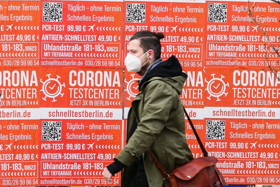 A pedestrian wearing a face mask walks past posters of a COVID-19 test site in Berlin, capital of Germany, April 16, 2021. (Photo by Stefan Zeitz/Xinhua)
