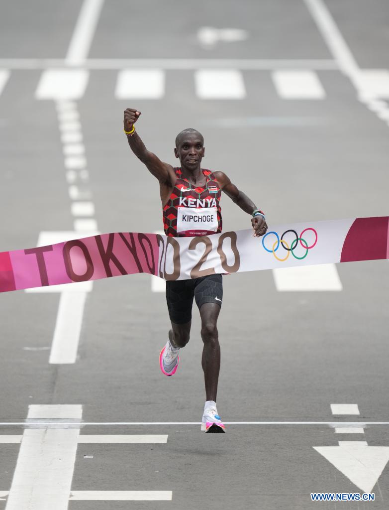 Eliud Kipchoge of Kenya celebrates after the men's marathon final at the Tokyo 2020 Olympic Games in Sapporo, Japan, Aug. 8, 2021. (Xinhua/Ju Huanzong)