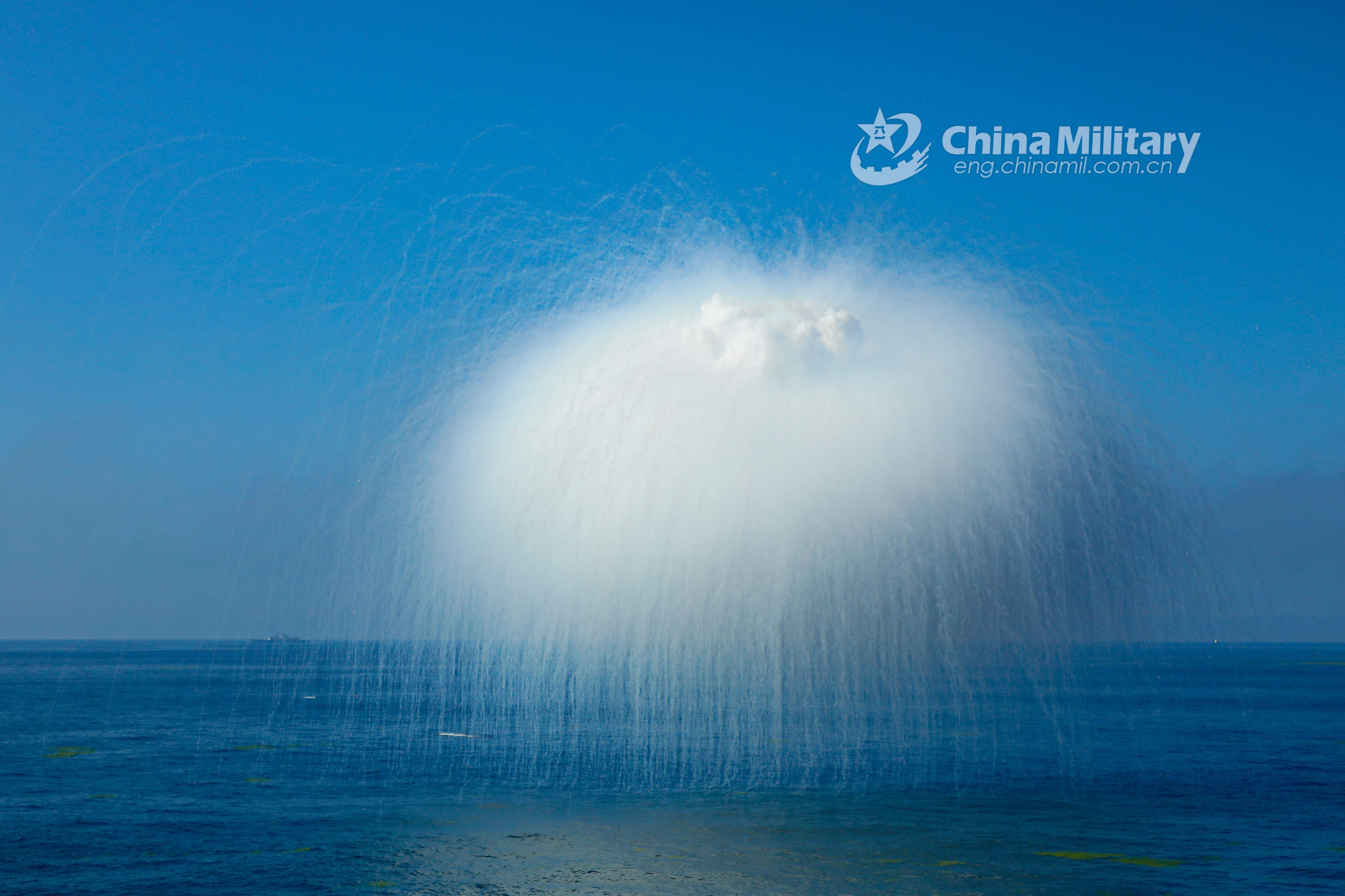 A jamming bomb launched by the guided-missile frigate Yantai (Hull 538) casts a pall of smokescreen in waters of the Yellow Sea during a maritime realistic training exercise in late July. The training exercise focused on subjects including striking maritime and aerial targets, joint search and rescue, anti-submarine operation, warship and airplane cooperative training. (eng.chinamil.com.cn/Photo by Liu Yangyang)