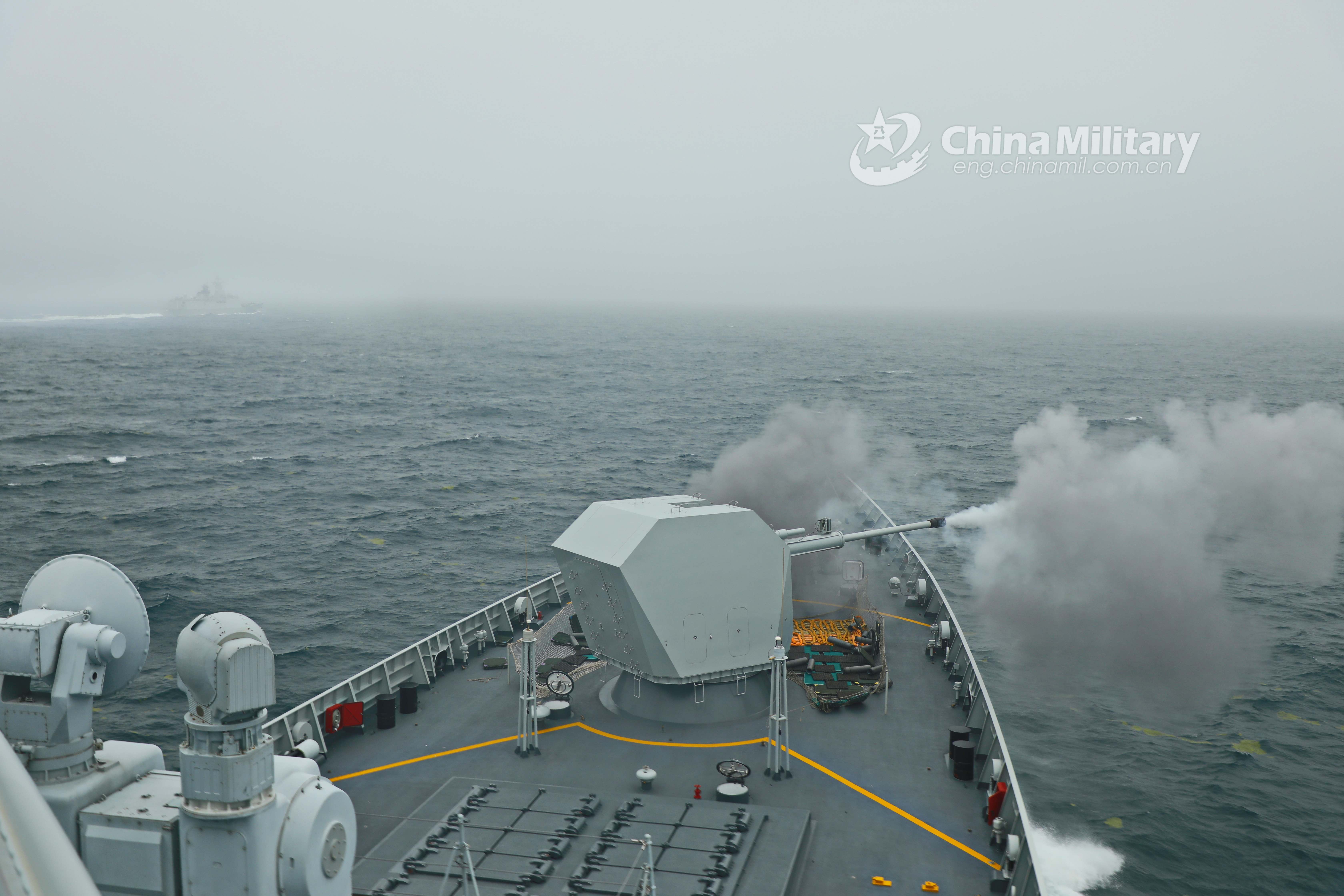 The guided-missile frigate Yantai (Hull 538) attached to a destroyer flotilla with the navy under the PLA Northern Theater Command fires its main gun at mock sea targets during a maritime live-fire training exercise in waters of the Yellow Sea in late July. The training exercise focused on subjects including striking maritime and aerial targets, joint search and rescue, anti-submarine operation, warship and airplane cooperative training. (eng.chinamil.com.cn/Photo by Du Jiangfan)