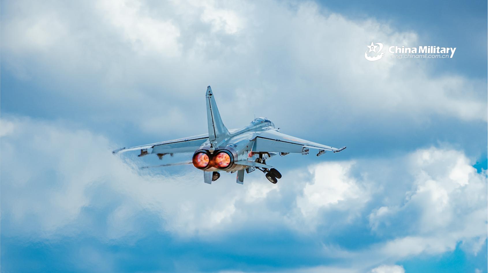 A fighter bomber attached to a naval aviation brigade under the PLA Northern Theater Command pierces into the stratosphere through clouds and mist during a round-the-clock flight training exercise in late July. (eng.chinamil.com.cn/Photo by Li Mingxi and Liu Xuhong)