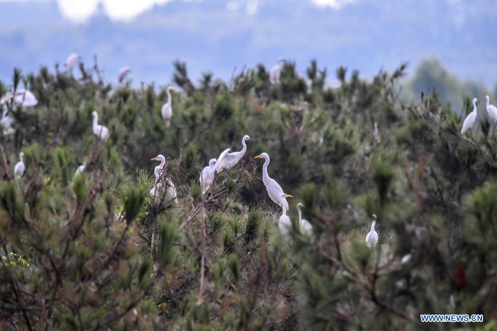 A flock of herons perch on trees in Wangjia Village of Sitang Township in Guilin City, south China's Guangxi Zhuang Autonomous Region, Aug. 12, 2021. (Xinhua/Cao Yiming)