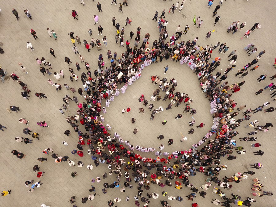 Aerial photo taken on Feb. 19, 2021 shows tourists and villagers dancing on a square at Huawu Village in Xinren Miao Township, Qianxi City, southwest China's Guizhou Province. (Xinhua/Yang Wenbin)