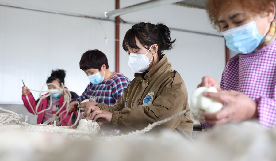 Yan Jiaxin (2nd R) and other female workers make handicraft goods in Qiaotuo Village of Tai'an County, Anshan, northeast China's Liaoning Province, March 4, 2021. (Xinhua/Yao Jianfeng)