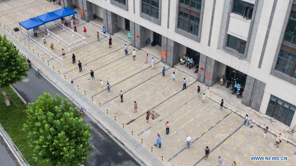 Residents queue up to receive nucleic acid tests at a testing site in Yangzhou, east China's Jiangsu Province, Aug. 14, 2021. The city of Yangzhou launched a new round of mass nucleic acid testing in key areas on Saturday. (Xinhua/Li Bo)