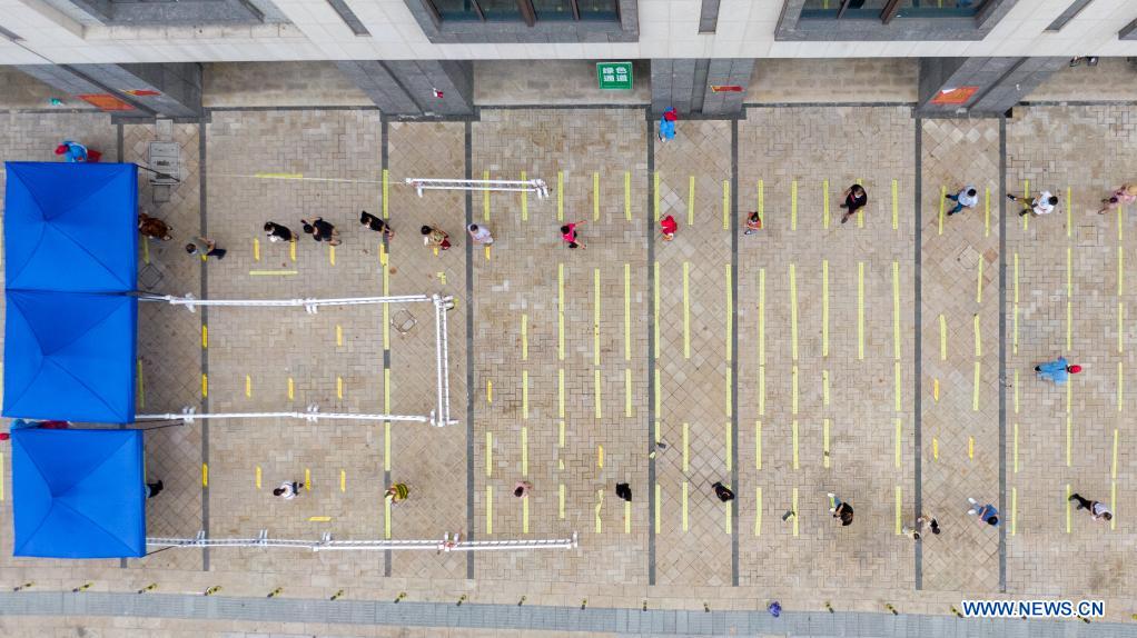 Residents queue up to receive nucleic acid tests at a testing site in Yangzhou, east China's Jiangsu Province, Aug. 14, 2021. The city of Yangzhou launched a new round of mass nucleic acid testing in key areas on Saturday. (Xinhua/Li Bo)