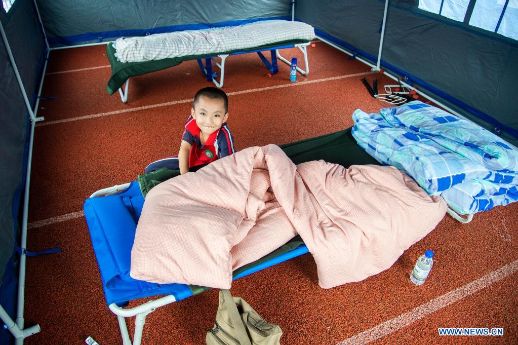 A child is seen at a temporary shelter at a school in Liulin Township in Suizhou, central China's Hubei Province, Aug. 14, 2021. Over 8,000 people have been affected in the township hit by heavy rainfall. (Photo by Wu Zhizun/Xinhua)