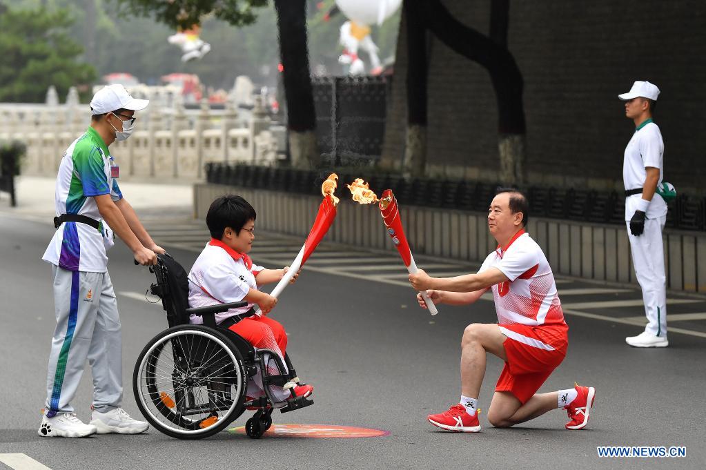 Torch bearers Yang Jianke (2nd R) and He Pei (2nd L) pass the flame during the torch relay for China's 14th National Games, 11th National Paralympic Games, and eighth National Special Olympics in Xi'an, Shaanxi Province, Aug. 16, 2021. (Xinhua/Liu Xiao)