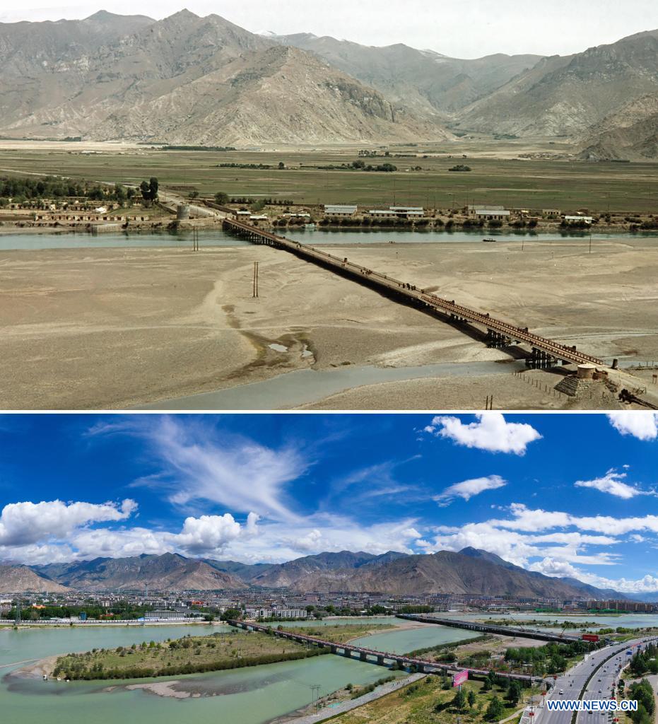 In this combo photo, the upper part taken by Wang Chunde in the 1950s and the lower part taken by Sun Fei on Aug. 9, 2021 shows views of the Lhasa Bridge, southwest China's Tibet Autonomous Region. On May 23, 1951, the Agreement of the Central People's Government and the Local Government of Tibet on Measures for the Peaceful Liberation of Tibet (17-Article Agreement) was signed, officially proclaiming the peaceful liberation of Tibet. The year 2021 marks the 70th anniversary of the historic event. (Xinhua)