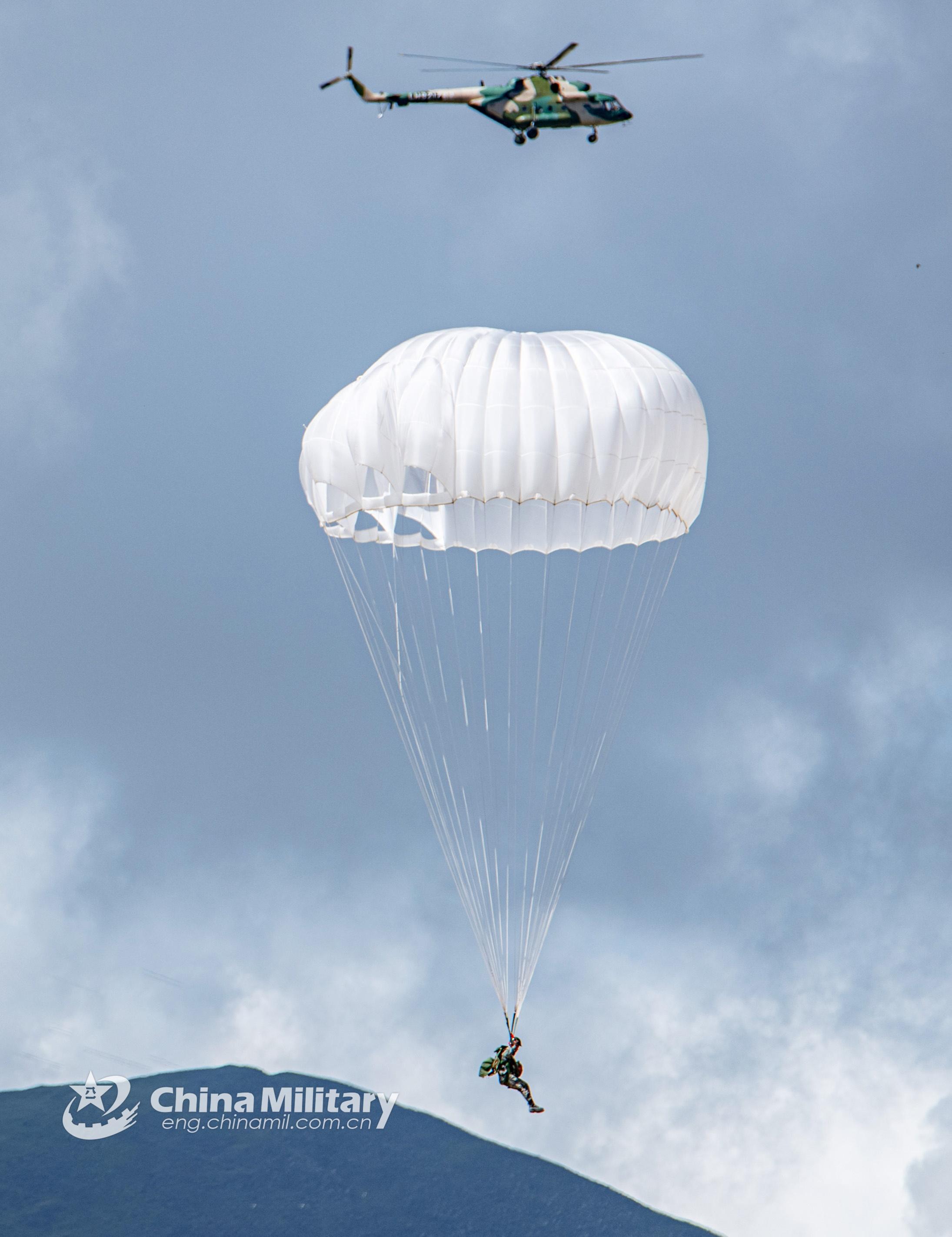 A paratrooper assigned to a special operations brigade under the PLA Tibet Military Command opens his parachute while descending to the drop zone after jumping out of a transport helicopter during a training exercise on July 30, 2021. This exercise effectively beefed up the paratroopers’ multi-dimensional assault and penetrating strike capabilities on plateau. (eng.chinamil.com.cn/Photo by Wang Shudong)