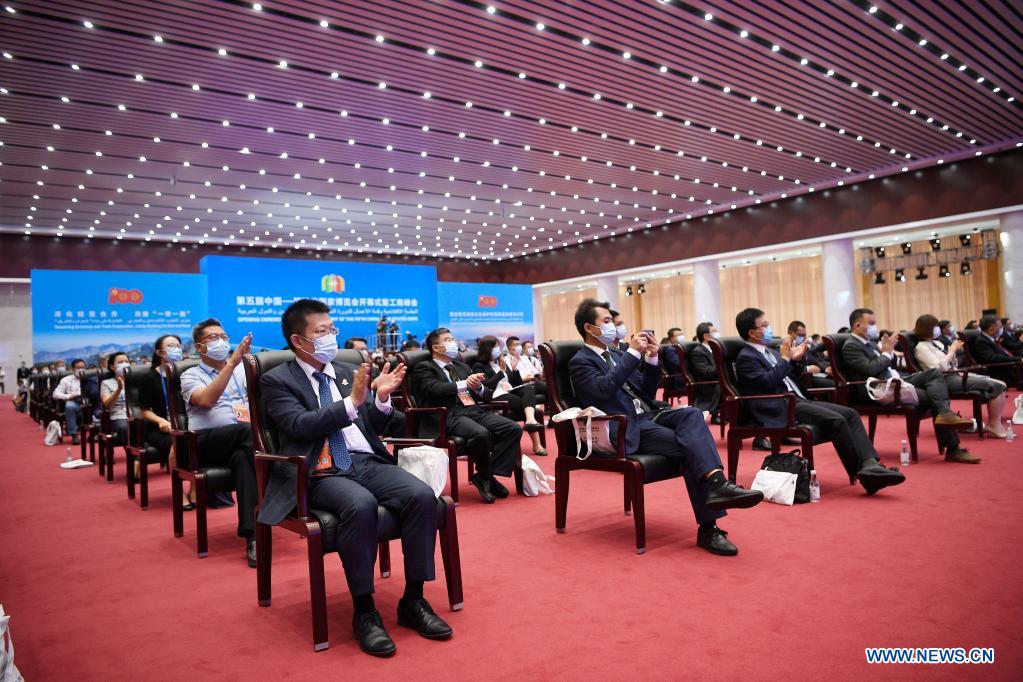 Guests attend the fifth China-Arab States Expo in Yinchuan, northwest China's Ningxia Hui Autonomous Region, Aug. 19, 2021. The four-day event will feature trade fairs and forums on digital economy, clean energy, water resource, modern agriculture, green food, cross-border e-commerce and tourism cooperation. (Xinhua/Wang Peng)