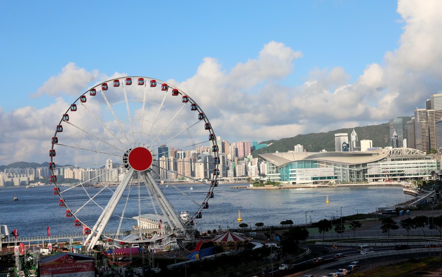 Photo taken on July 8, 2021 shows a view of a ferris wheel and the Hong Kong Convention and Exhibition Center in Hong Kong, south China. (Xinhua/Wu Xiaochu)