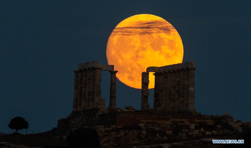 A full moon is seen over the Temple of Poseidon at cape Sounion, some 70 km southeast of Athens, Greece, on Aug. 21, 2021. (Xinhua/Marios Lolos)